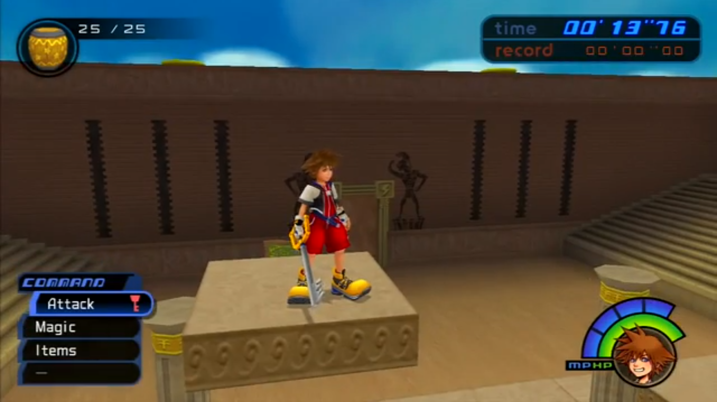 Kingdom Hearts is an unintuitive game where you’ll waste a lot of time wandering around aimlessly. It’s fine I guess if you’ve played it before, but with its uninspiring world there is little motivation to get exploring, and little fun in doing so. The game’s flat opening is a particularly pointless fetch quest where have to find logs, mushrooms and other dull objects.