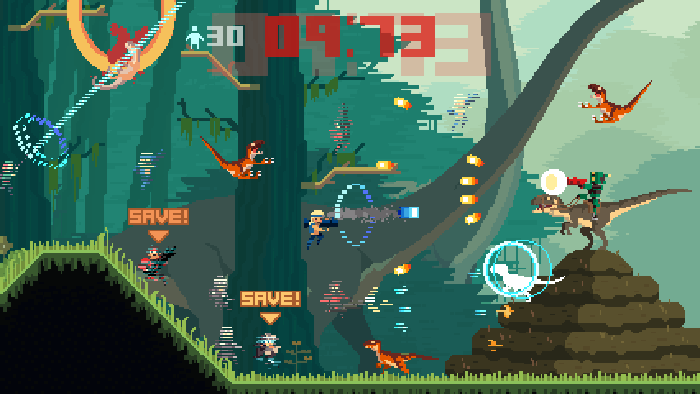 On first glance the gameplay may appear to resemble a fairly standard side scrolling shooter, but how the game is played is drastically altered by the inclusion of a complex time travel mechanic. You start each level with thirty lives and a strict time limit. With no other choice, you rush forward only to encounter an onslaught of enemies. Maybe you kill one or two, but you almost certainly get killed yourself. Now the game gives you the chance to rewind to any point, from just before your death back to the start of the level, and then respwans you alongside the ghost of your past attempt. Now when you face that group of enemies there are two of you, and if you die again there will be three.
